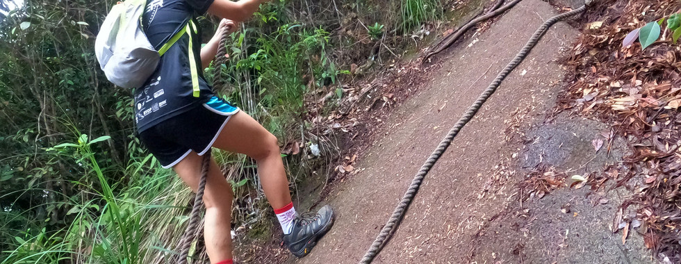 After finishing the KFC we reached the most famous part of the hike, the roped climbing section! This part is probably the most well known part of the hike as it looks sooo cool! A few years ago, when I first heard of Mount Ophir, I saw some photos of this and immediately I wanted to climb this hahaha. Fast forward 4 years and I'm finally here! The roped part consists of 2 sections. The first part is a shorter part about 15-20m long with a very steep incline, it was sort of like a warmup for the bigger one to come soon. The second section of it was longer, at about 20-30m long, the steepness starts off gentle and quickly becomes very steep at one part, maybe 60 - 70 degrees, then afterwards becomes gentler again. For those with good upper body strength, its not hard to climb as there are knots on the rope which help in gripping the rope and pulling yourself up! However, for those with weaker arms, it will be slightly challenging. But worry not, as there is actually a "secret" path at the side where you can go around and skip this rope section haha. I guess this was all actually just for the gram LOL.